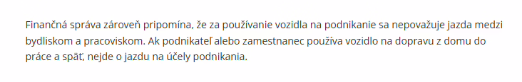 “za používanie vozidla na podnikanie sa nepovažuje jazda medzi bydliskom a pracoviskom. Ak podnikateľ alebo zamestnanec používa vozidlo na dopravu z domu do práce a späť, nejde o jazdu na účely podnikania“ – toto zverejnila Finančná správa. Iba tak, na webe. Čo je samozrejme výklad bez akejkoľvek právnej záväznosti. No prvýkrát niečo k téme, čo je vlastne “používanie auta na podnikanie”.